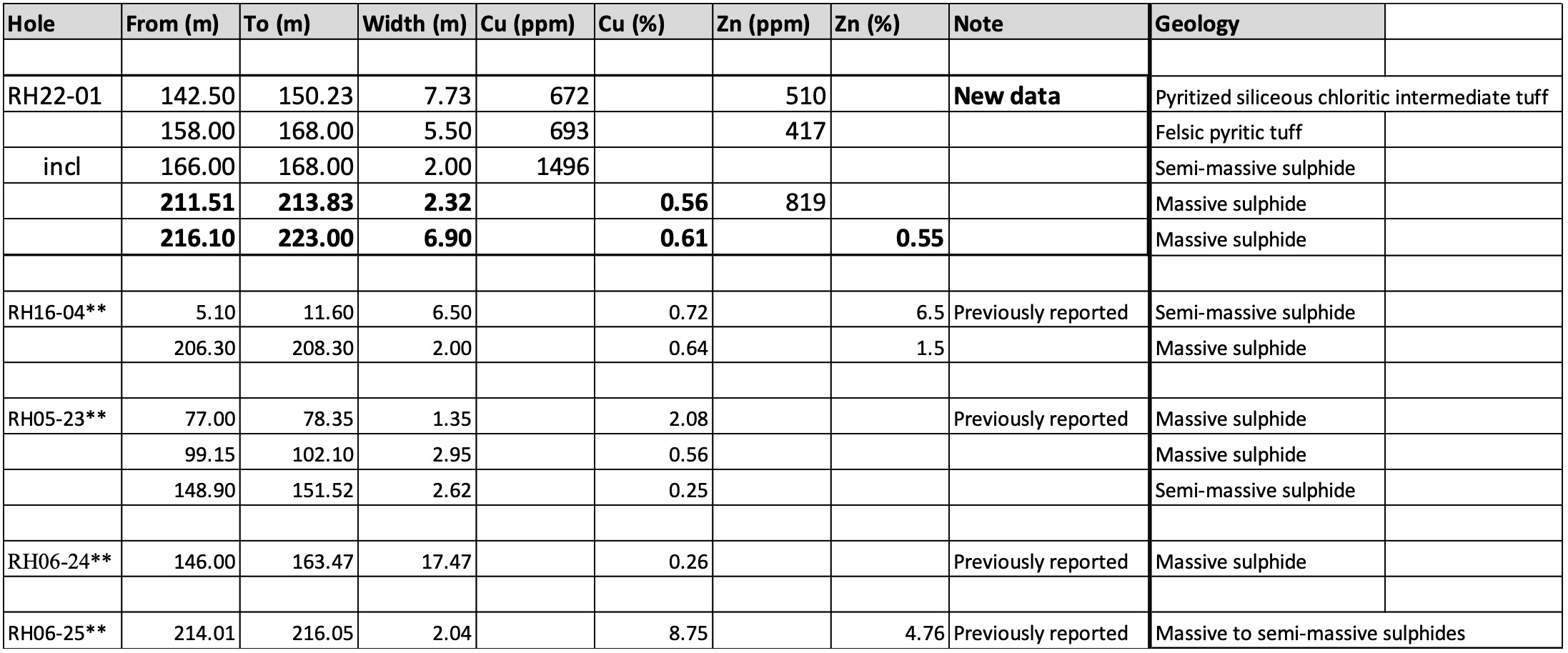 - Hole RH22-01 intersected two horizons of copper-zinc rich volcanogenic massive sulphide mineralization: