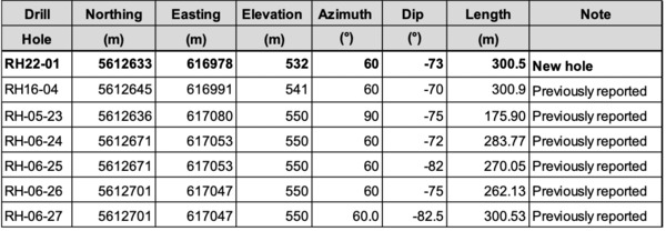 VMS mineralization has been intersected over approximately 100 meters along a northwest trend, and to a depth of approximately 200 meters. Three previous holes, RH05-23, RH06-24 and RH06-25, had also intersected VMS mineralization, however, the intercept in RH22-01 is the most significant with respect to copper and zinc grades, and thickness.